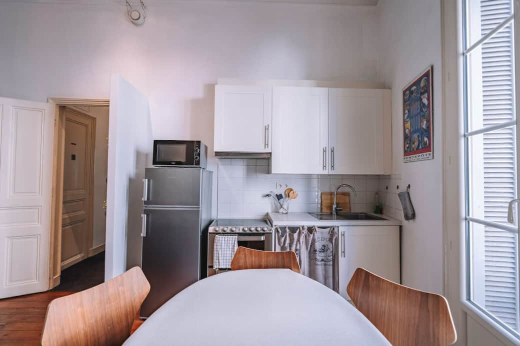 La pièce de vie lumineuse se compose d’une cuisine entièrement équipée, ouverte sur un espace repas convivial et un salon chaleureux avec canapé convertible, idéal pour se détendre après une journée de découverte dans la ville.